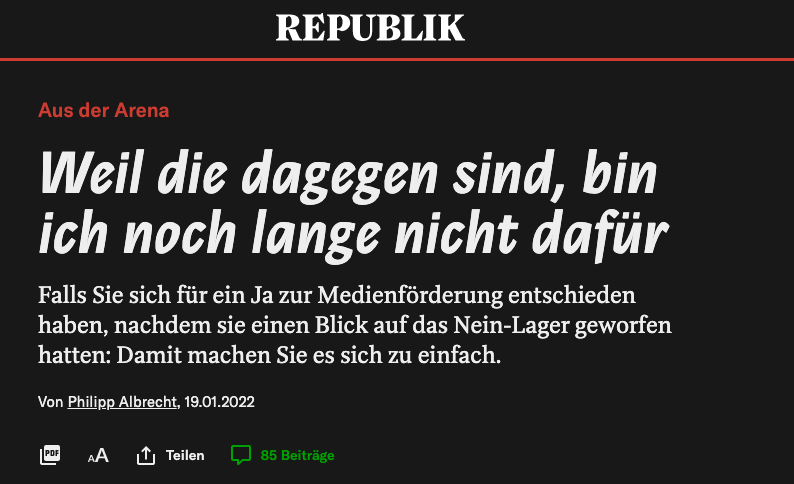 Es soll Leute geben, die einzig und alleine Ja zur Medienförderung gesagt haben, nachdem sie einen Blick auf unser Referendums-Komitee geworfen hatten: Damit machen sie es sich zu einfach. Sagt Philipp Albrecht, Wirtschaftsredaktor bei der Republik, welche sich stark für das Mediengesetz einsetzt.